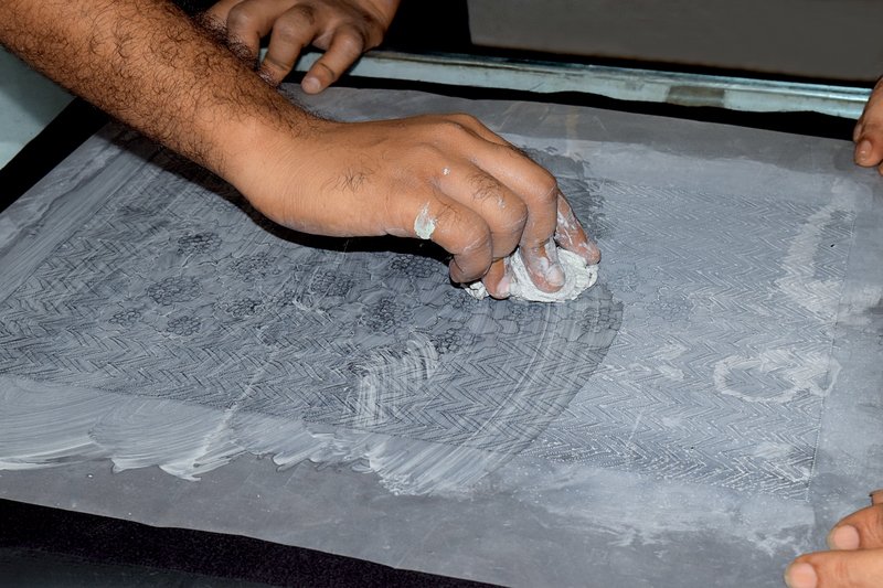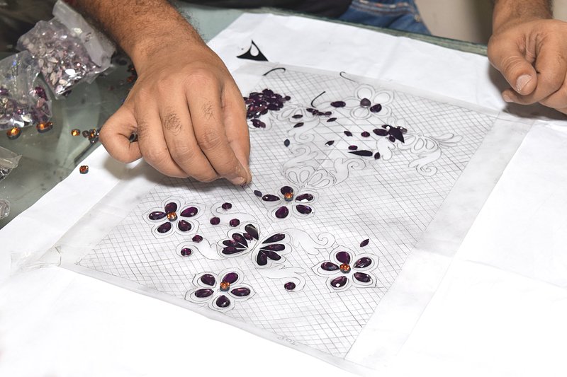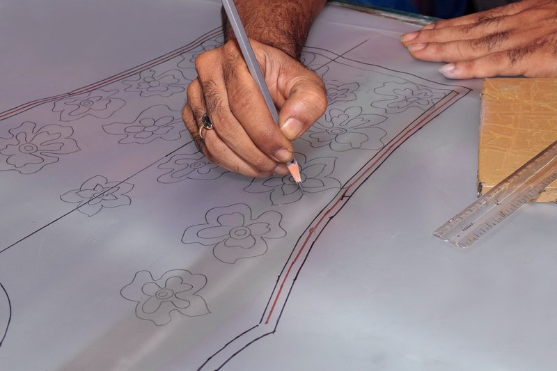 Swatches once approved, are drafted onto a tracing paper. The artisans use frames to hold the fabrics and the embroiderers start the time to consume, a strikingly distinguished process of embroidery. Replication of the original swatch onto the fabric is done keeping in mind the colour, technique and designs of the finest quality.