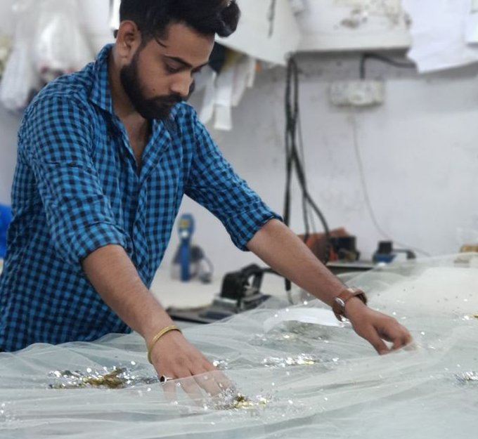 The next step is embroidering the designs onto the fabric. The artisans use frames to hold the fabrics and the embroiderers start the time to consume, a strikingly distinguished process of embroidery. They replicate the original swatch onto their fabric, keeping in mind of the colour schemes and techniques.
